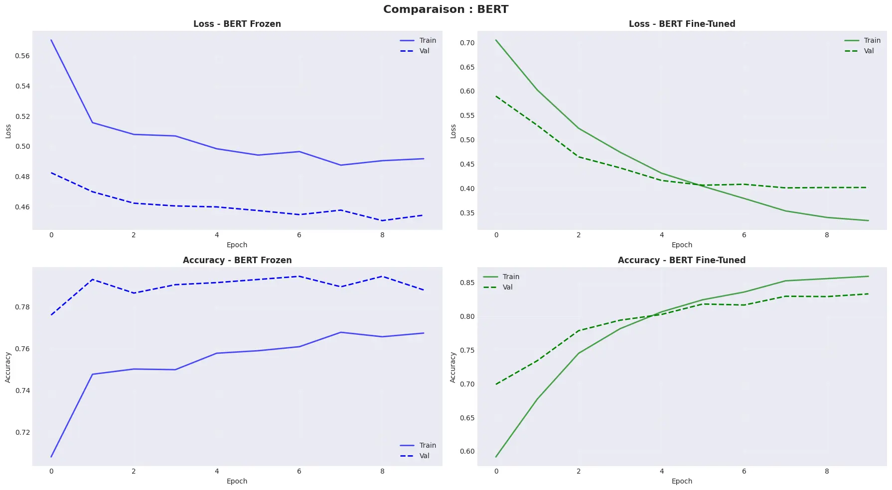 The verdict is clear: full fine-tuning clearly outperforms feature extraction on this dataset. Frozen BERT produces generic representations that fail to capture the subtleties of Steam's gaming jargon. Fine-tuning redirects the attention layers toward the player-specific vocabulary. This approach is retained for all subsequent phases.