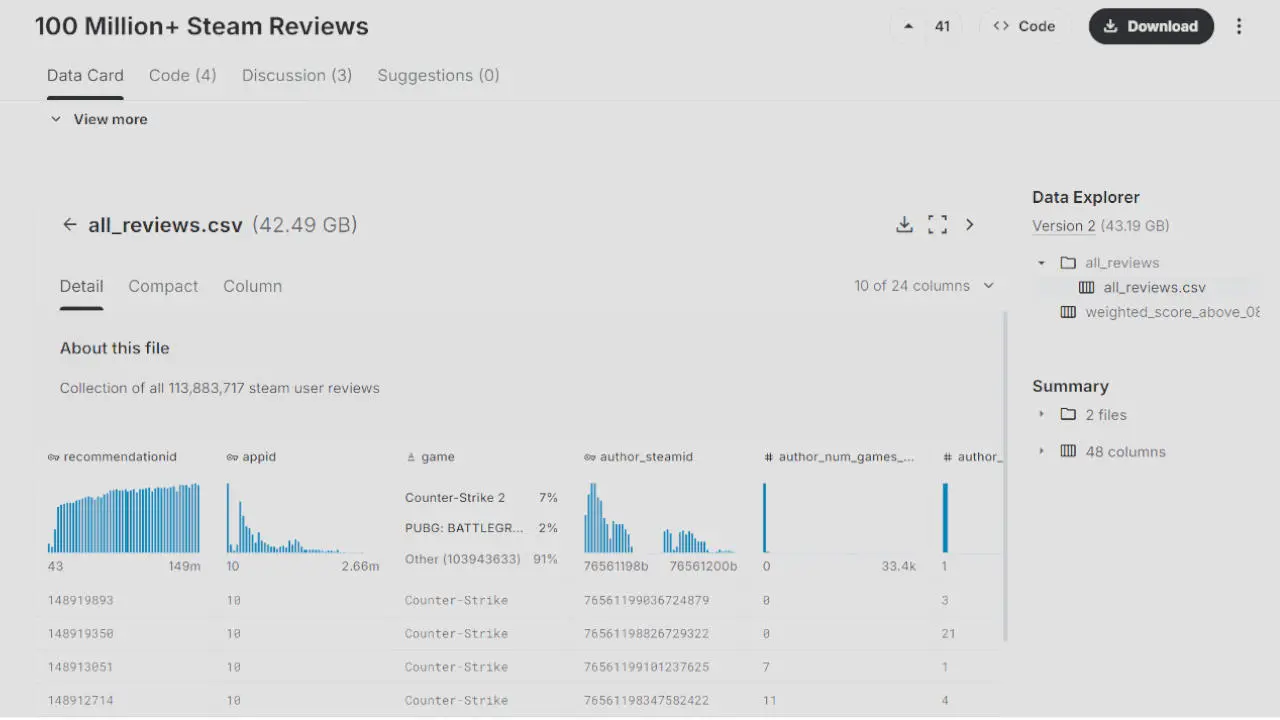The starting point is the Kaggle Steam Reviews dataset: approximately 100 million reviews annotated with sentiment in multiple languages, totaling 40 GB of raw data.