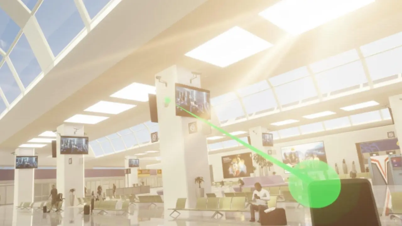 Premier acte - L'aéroport connecté : les visiteurs explorent un hall d'aéroport entièrement reconstitué en 3D où ils découvrent comment les différentes solutions interagissent pour assurer la sécurité et le bon fonctionnement de l'infrastructure.